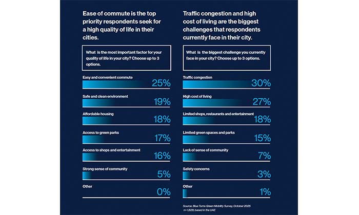 The white paper also incorporates findings from Al-Futtaim’s “Blue Turns Green – Mobility” survey, capturing the views of 1,828 UAE residents. The results highlight strong public expectations for better-connected, time-efficient cities: ease of commute emerged as the top quality-of-life priority, while congestion and cost of living ranked as the most pressing urban challenges. These insights reinforce the need for structural, long-term reform rather than incremental changes.